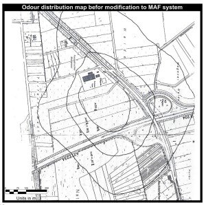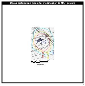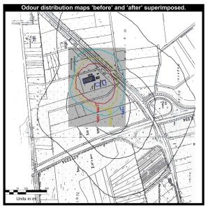To reflect the dramatic reduction in odour emissions after converting to the MAF Composting System, the ‘before’ and ‘after’ odour distribution maps are shown superimposed on the third chart.